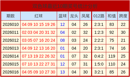 上期双色球的开奖号码中,和值为85,跨度为26,012路比为3:2:1。