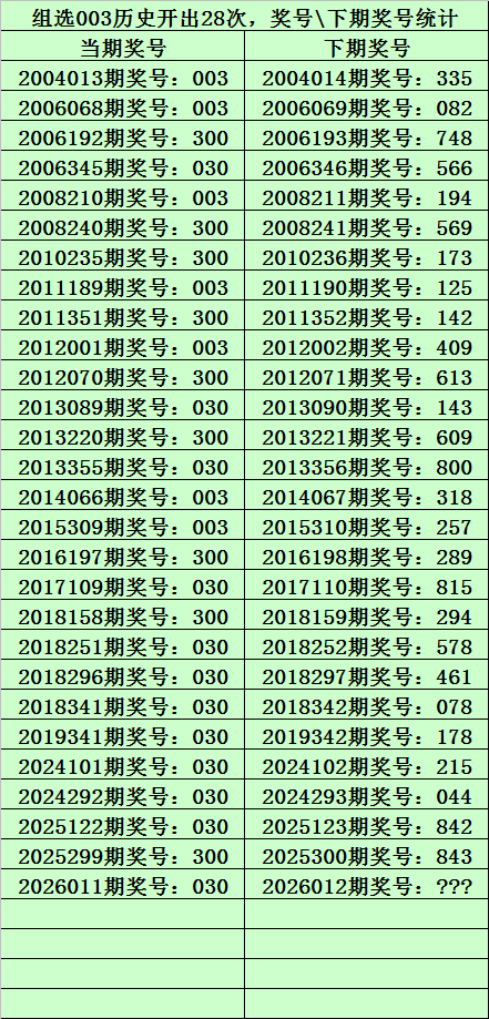 二、组选003分析:排列三历史上已开出28次组选号码003了,其奖号和下期开出奖号统计如下: